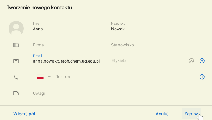 Utwórz w ten sposób co najmniej dwa nowe kontakty (jednym z nich MOŻE być prowadzący zajęcia).