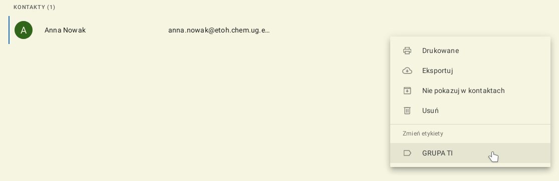 Przycisk "Zapisz" (zależnie od wersji interface) może się znajdować POWYŻEJ edytowanej wizytówki. Teraz można dodać kontakt do wcześniej utworzonej etykiety.