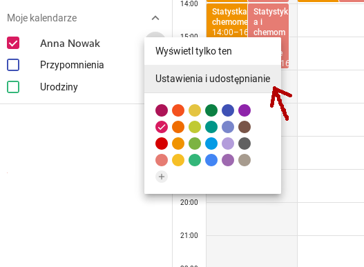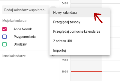 Wypróbuj tryb konferencyjny w którym czatujesz z kilkoma osobami. Google Apps oferuje wygodny kalendarz: Wykorzystaj go do przygotowania swojego tygodniowego planu zajęć. Aby utworzyć nowy kalendarz wybierz Moje kalendarze -> Utwórz nowy kalendarz:
