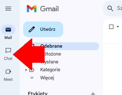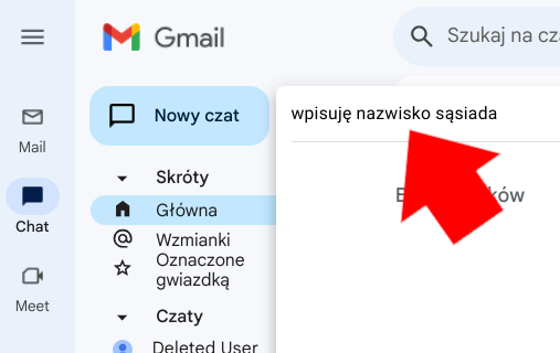 Wyślij e-mail do nowo utworzonej grupy przedstawiając się. Ulubioną rozrywką użytkowników internetu jest chat, czyli internetowe pogaduszki. Wśród dziesiątek starych i nowych komunikatorów i platform obsługujących tego typu komunikację (jak kiedyś GG, ICQ, tlen, MSN, Skype, Discord itp.). My będziemy używać Google Chat. Ikona dostępowa do chat-u znajduje sie po lewej stronie okna głównego Poczty: