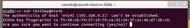 Przy pierwszym wydaniu tego polecenia pojawi się ostrzeżenie, że po raz pierwszy łączymy się z tym serwerem i czy aby na pewno chcemy kontynuować. Będzie to wyglądało tak: