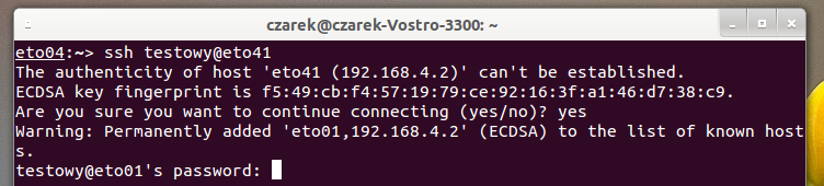 (ssh to polecenie, testowy to nasz login, a eto41 to nazwa komputera, na który właśnie się logujemy, znak @ ("at") zawsze wstawiamy przed nazwą komputera, czy też serwera - na pewno spotkałeś się z tym już w adresach poczty elektronicznej).