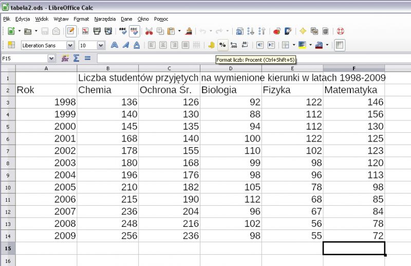 W nowym arkuszu kalkulacyjnym otwórz plik tabela2.ods (został pobrany na początku ćwiczenia).