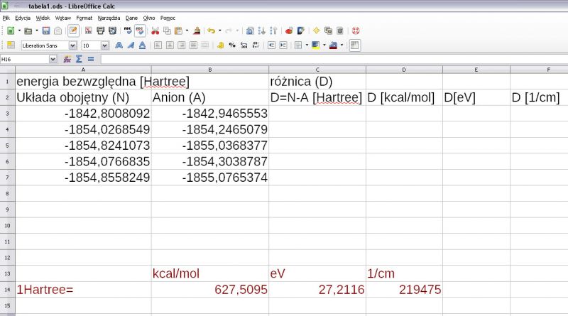 (w kolumnie D), eV (kolumna E) oraz 1/cm (kolumna F). Na przykład: w komórce D3 trzeba napisać =C3*$B$14 (zapis