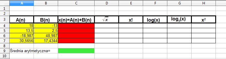 Aby uzupełnić kolejne komórki tabeli wykonuj czynności analogicznie jak w punkcie 5 wybierając do tego odpowiednie funkcje: silnia, logarytm i potęga. Uwaga - w przypadku logarytmu o podstawie 5, najpierw wpisz podstawę (5), a następnie