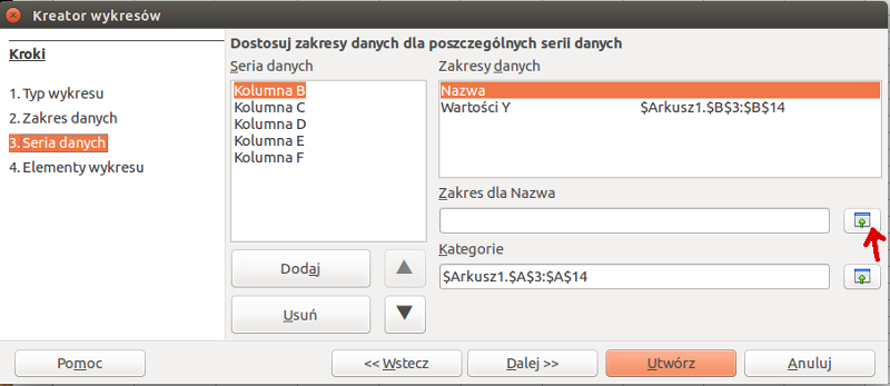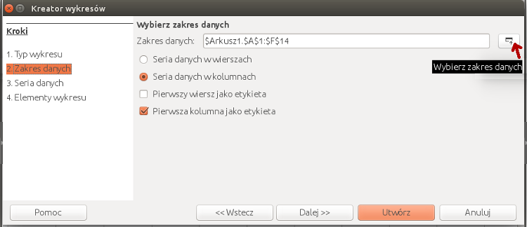 W kolejnym kroku należy wybrać Zakres danych. Aby to zrobić kliknij na małą ikonkę w prawej części kreatora wykresów