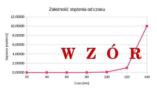 Wykonaj wykres liniowo-punktowy zależności stężenia od czasu. Czas powinien znajdować się na osi X, a stężenie na osi Y. Dodaj do wykresu tytuł i opisy osi. Kolor linii i symbole możesz wybrać dowolnie.