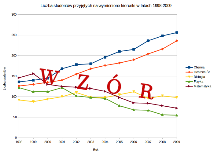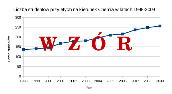 W ostatnim kroku Elementy wykresu wpisz Tytuł Liczba studentów przyjętych na kierunek Chemia w latach 1998-2009, Oś X opisz jako Rok, Oś Y jako Liczba studentów. Następnie
