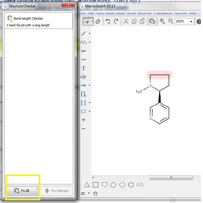 Pamiętaj, że struktury mogą być na początku rysowane mniej dokładnie. Na końcu zawsze należy użyć opcji Check Structure. Przed wyeksportowaniem dodaj Analysis Box, w którym jak przy nikotynie będzie: Traditional name; Name; Formula i Molecular weight.