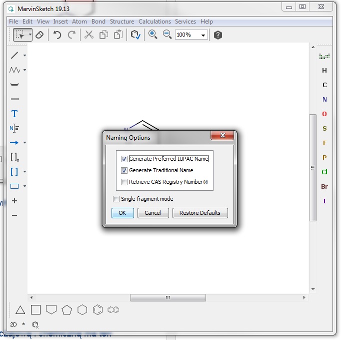 Aby uruchomić program, w panelu głównym należy wpisać MarvinSketch. Przy otwieraniu należy wybrać powłokę Marvin (active). Otworzy się okno programu: